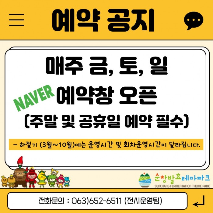 시설안내 종합안내도 캐릭터 소개 전시시설 발효소스토굴홍메관팡이관효모관다년생식물원햇살라운지 놀이시설 콩이관 1층콩이관 2층고고관 야외시설 천년광장팡이공원 편의시설 F&B기타편의시설기념품샵 이용정보 입장요금 운영시간 이용유의사항 오시는길 교육행사 행사·이벤트 교육프로그램 알림마당 공지사항 자료실 사진자료홍보자료 자주묻는질문 예약 개인예약 단체예약 신청내역확인