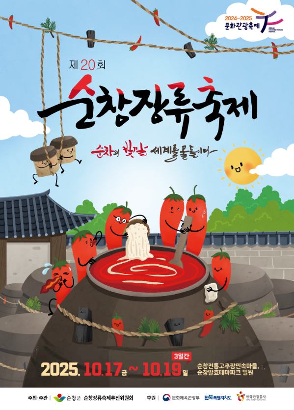 제20회 순창장류축제 행사기간2025-10-17(토)~2025-10-19(일) 행사시간10:00~ 이용대상전연령 본문 순창의 빛깔 세계를 물들이는 제20회 순창장류축제가 10월에 열립니다. 발효나라1997, 순창고추장 임금님 진상행렬, 메주만들기, 장 담그기 등 여러 체험프로그램과 20주년을 맞아다양한 공연들이 준비중이니 풍성한 10월에 꼭 찾아주세요 이전글해피 추석 EVENT 25.09.30 다음글순창 KOREA 떡볶이 페스타 25.08.13 목록 댓글 0 댓글목록 등록된 댓글이 없습니다.