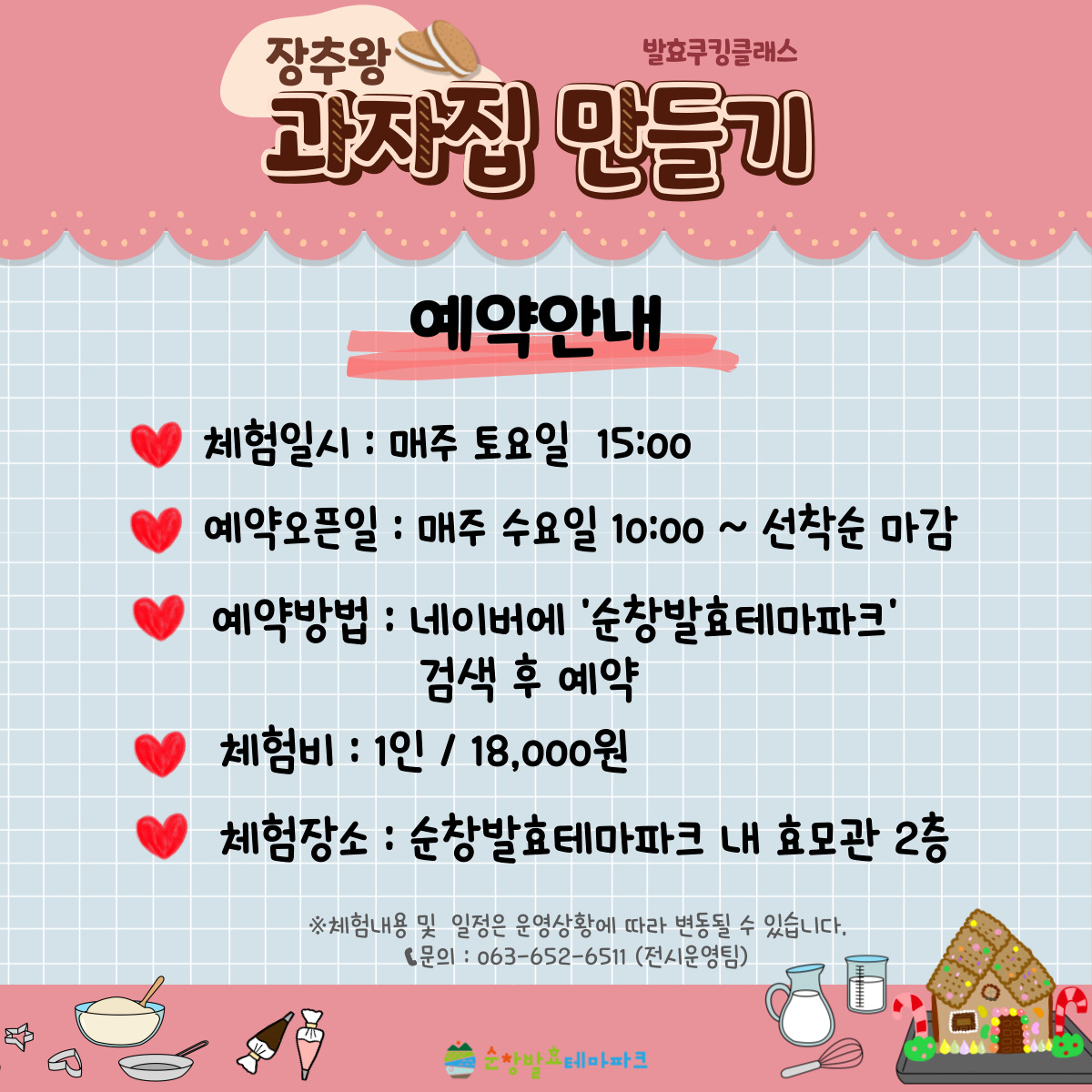 2025 발효쿠킹클래스 (장추왕 과자집만들기) 행사기간2025년 10월~ 행사시간매주 토요일 15:00 접수기간체험 주 수요일 예약 이용대상전연령 참 가 비18,000원 네이버 예약신청 바로가기 본문 이전글2025 발효미생물프로젝트 (고보습 아토피폼 바디로션 만들기) 25.10.02 다음글2025 발효쿠킹클래스 (마카롱 만들기) 25.09.30 목록 댓글 0 댓글목록 등록된 댓글이 없습니다.