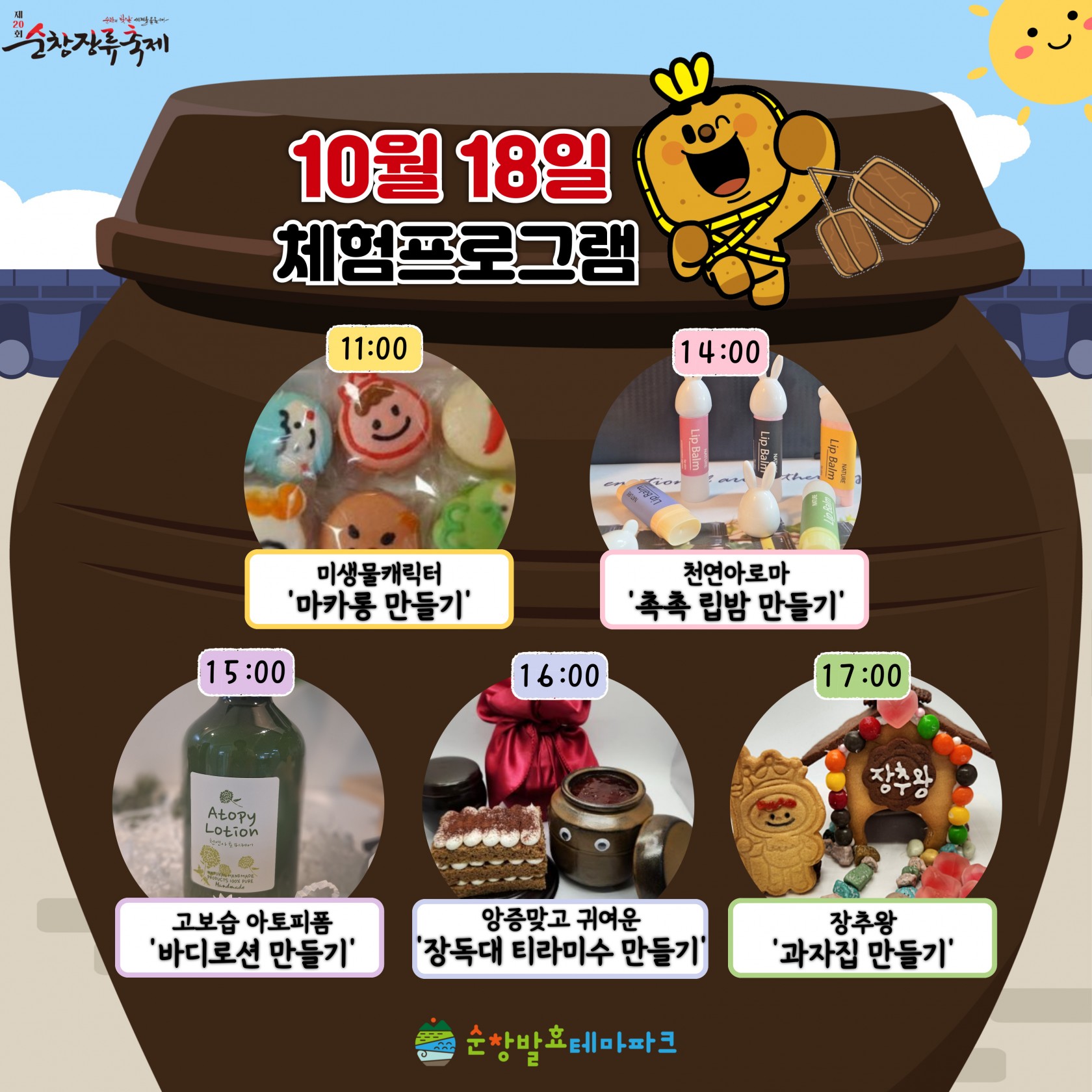 2025 순창장류축제 체험프로그램 행사기간2025년 10월 18일~19일 행사시간홈페이지 참조 접수기간10월 15일 10:00 이용대상전연령 참 가 비홈페이지 참조 네이버 예약신청 바로가기 본문 다음글2025 발효미생물프로젝트 (고보습 아토피폼 바디로션 만들기) 25.10.02 목록 댓글 0 댓글목록 등록된 댓글이 없습니다.